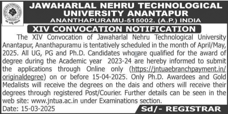 The XIV Convocation of Jawaharlal Nehru Technological University Anantapur, Ananthapuramu is tentatively scheduled in the month of April/May, 2025. All UG, PGandPh.D. candidates who are qualified for the award of degree during the Academic Year 2023-24( Passed out on or before 01.03.2025) and Ph. D degree those who have been awarded after XIIIconvocation are hereby informed to submit the applications through online only(https://jntuaebranchpayment.in/originaldegree/) on or before 15.04.2025.