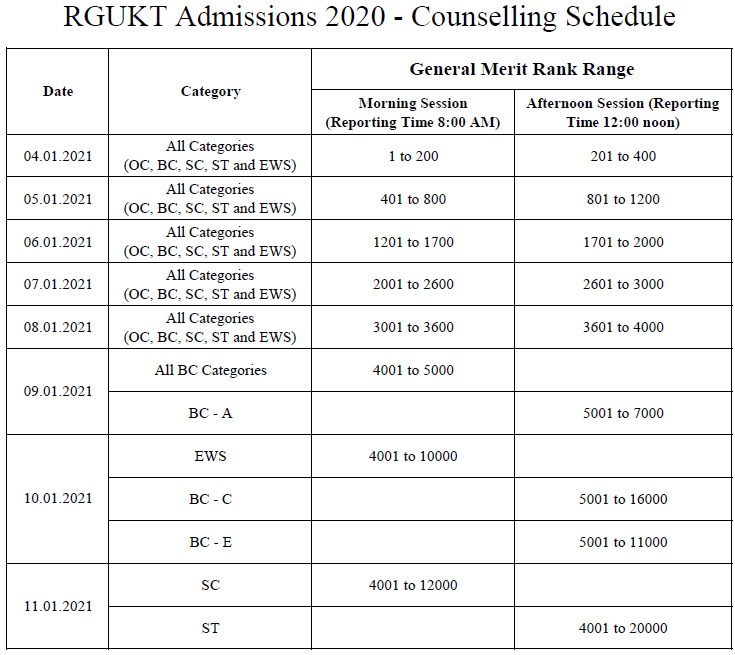 | 3. | Counselling for Nuzvid Campus, RK Valley campus, Ongole Campus, Srikakulam Campus. Venue: RGUKT-Nuzvid Campus, Krishna District And Venue: RGUKT-RK Valley campus, Idupulapaya | 04.01.2021 to 12.01.2021 |