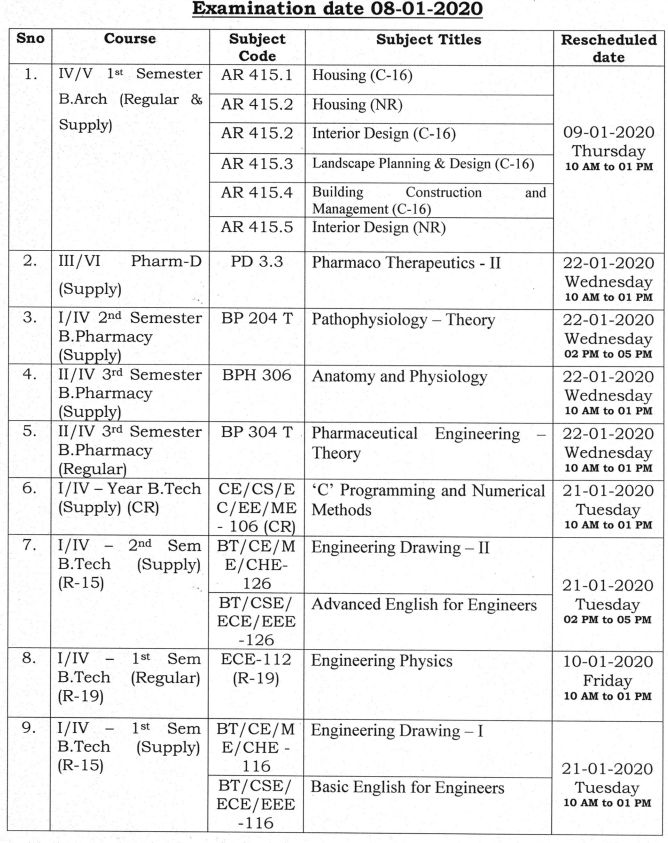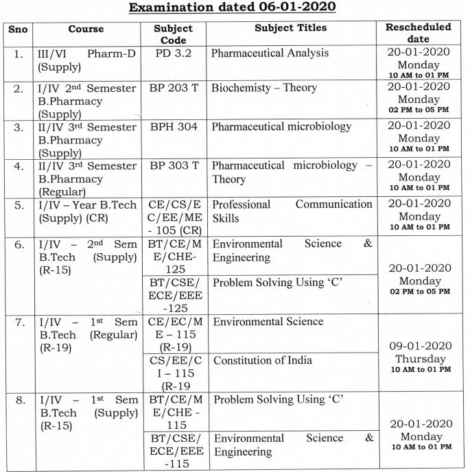 This is to inform you that the following examinations which will be held 06-01-2020 and 08-01-2020 are postponed due to Bundh and the same will conducted on different dates as shown in the table given below: