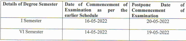 The Vice-Chancellor has ordered that the commencement of date of 1st & 6th Semester, UG Degree Examinations May, 2022 be postponed as shown against each.