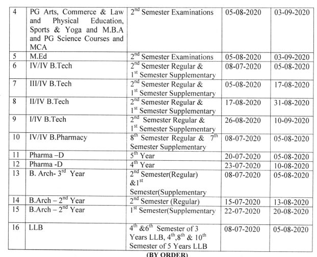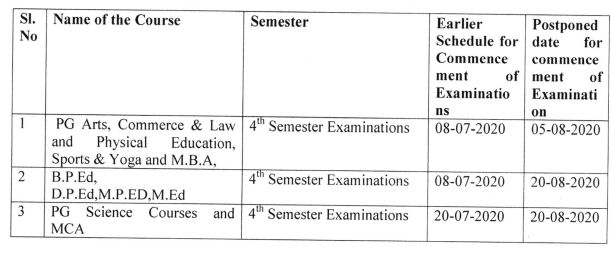 Having considered the guidelines of Govt. of India cited under read(6) and spread of COVID-19 in the region of University area, the Vice-Chancellor has ordered that the existing schedule for the Semester Exam inations,2020 of PG Arts, Commerce & Law and Physical Education, Sports & Yoga and M.B.A, PG Science Courses and MCA, B.Tech, B. Pharmacy, Pharma-D and B. Arch courses be Postponed as shown against each: