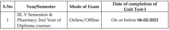 The class work for III, V Semesters & Pharmacy 2nd Year of Diploma courses has been started from 23-11-2020 and the schedule and mode of exam for unit test-I for III, V Semesters & Pharmacy 2nd Year of Diploma courses is as follows: