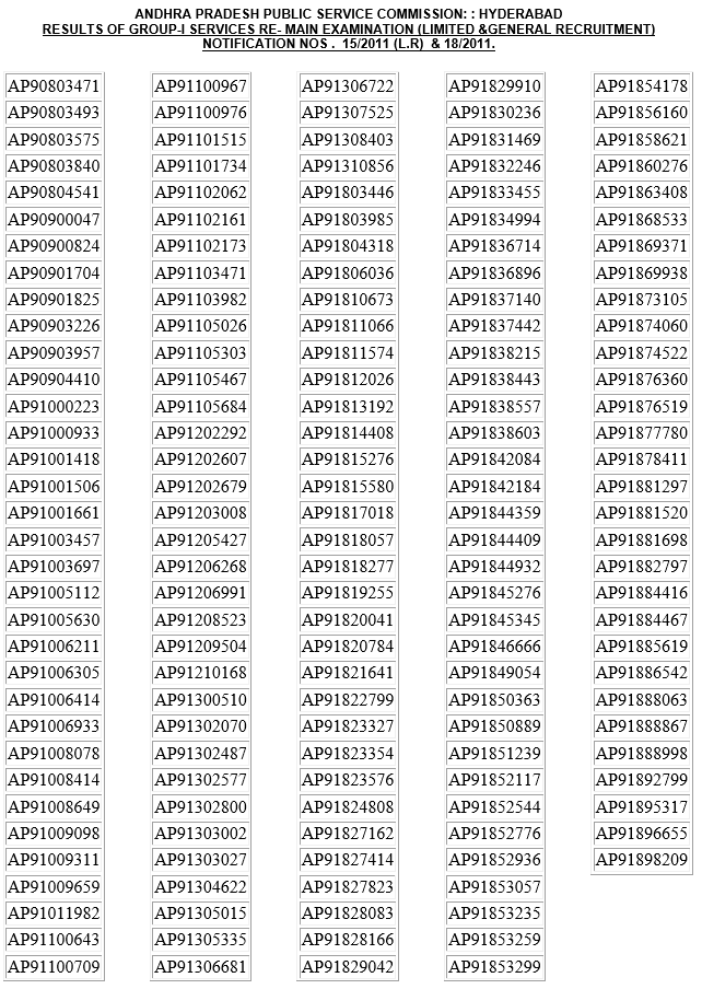 APPSC Group I Services Re-Mains Examination Results 2016: It is hereby notified that on the basis of the Re-Main Examination (Written) held from 14/09/2016 to 24/09/2016 at Hyderabad, Vijayawada, Visakhapatnam, and Tirupathi for Group-I Services (Limited & General) Recruitment vide Notification Nos: 15/2011 dated. 30.06.2011 & 18/2011 Dt.28.11.2011, the candidates with the following Register Numbers have been provisionally admitted for the ORAL TEST (Interview) in terms and conditions of Notification Nos.15/2011 & 18/2011 which will be held from 18/04/2017 to 10/05/2017, in the Commission’s Office, Prathibha Bhavan, Opp. Gagan Vihar, M.J. Road, Nampally, Hyderabad – 500 001.