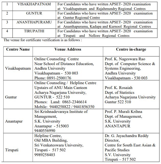 APSET Counselling Dates 2021 – Certificate Verification Schedule and Venues: The Certificate verification for the APSET-2020 qualified candidates will be conducted at the following Four Centres from 15-03-2021 TO 18-03-2021.