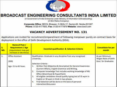 Broadcast Engineering Consultants India Limited (BECIL) released a notification for 378 Office Assistant and Data Entry Operator posts on a contract basis for deployment in the office of Delhi Development Authority (DDA). Interested and eligible candidates can apply online through BECIL’s official portal, becil.com. The online applications are presently accessible on BECIL portal and the last date to fill up the application is 25th April. BECIL Office assistant application process, eligibility criteria, important dates, and other details are mentioned in the following article.