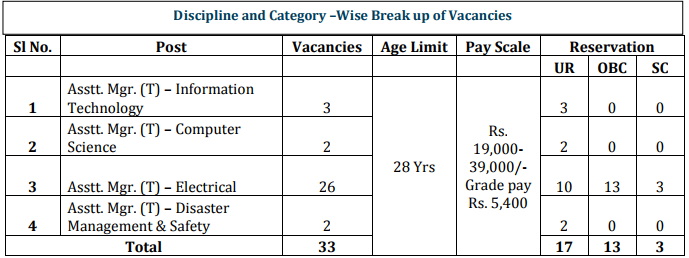 - Asstt. Mgr. (T) – IT: Degree in IT Engg. or Equivalent from a recognized University.