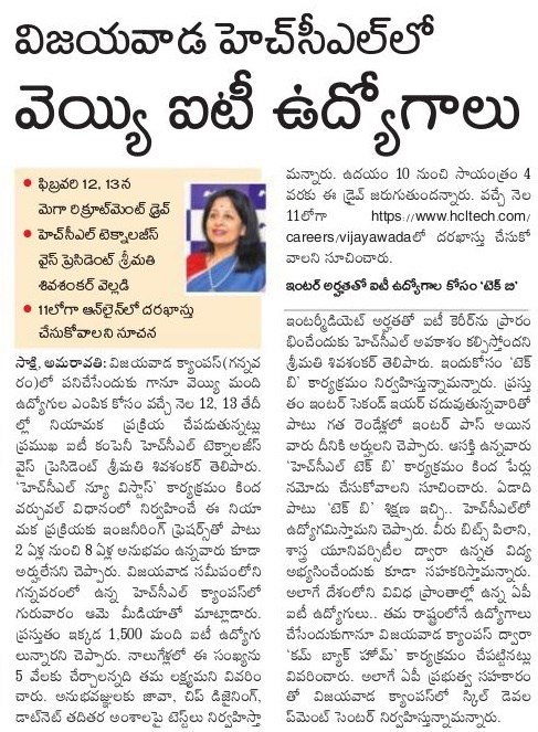 HCL Vijayawada Recruitment Drive for 1000 IT Jobs: A recruitment drive to be conducted on 12th, and 13th February in HCL Gannavaram. HCL Vice President Smt Siva Shankar has announced that eligible candidates can enrol before 11th Feruary through online at hcltech.com/careers/vijayawada. Aspirants who are having 2 to 8 years of experience in IT field and freshers aiming to get jobs in IT sector can register themselves for the HCL Vijayawada drive.