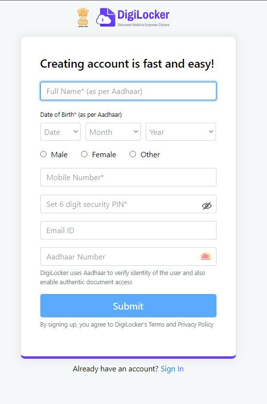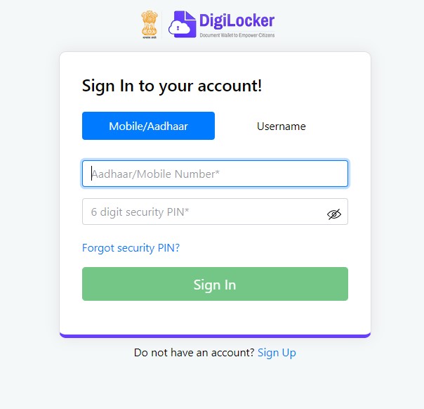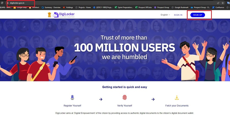 Step 1: Open digilocker.gov.in website and click on sign up.