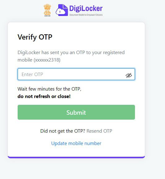 You will receive an OTP to your mobile number , Enter the OTP and click on SUBMIT.