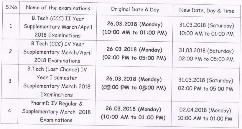 Subject: B.Tech (Last Chance), B.Tech (CCC) & Pharm.D Reg & Supple March/April 2018 Exams – 26.03.2018 (Monday) – Postponed & Rescheduled Circular
