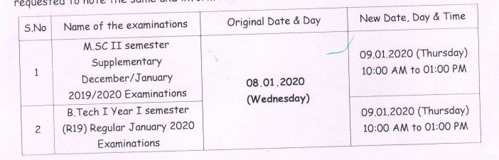 In view of Bandh, the University Examinations scheduled on 08-01-2020 (Wednesday) are rescheduled as indicated below. The Principals of all affiliated colleges are requested to note the same and inform the students concerned immediately.