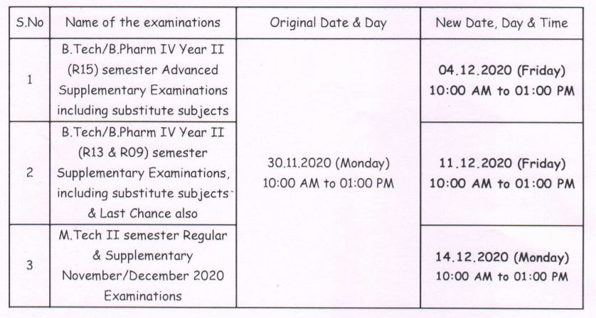 In view of NIVAR Cyclone , the M.Tech/B.Tech/B.Pharm Examinations scheduled on 30.11.202O (Monday) are rescheduled as indicated below. The Principals of all affiliated colleges are requested to note the same and inform the students concerned immediately