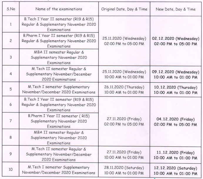 Based on the request from some colleges it is known that the normalcy is still not restored in Some areas, So the schedule given earlier was rescheduled again, for the B. Tech/ BPharm/ MBA/ M.Tech Regular Supplementary November/December 2020 Examinations/ which were originally scheduled on 25.11.2020 26.11.2020 27.11.2020 & 28.11.2020. The Principals are requested to note the same and inform the students concerned immediately.