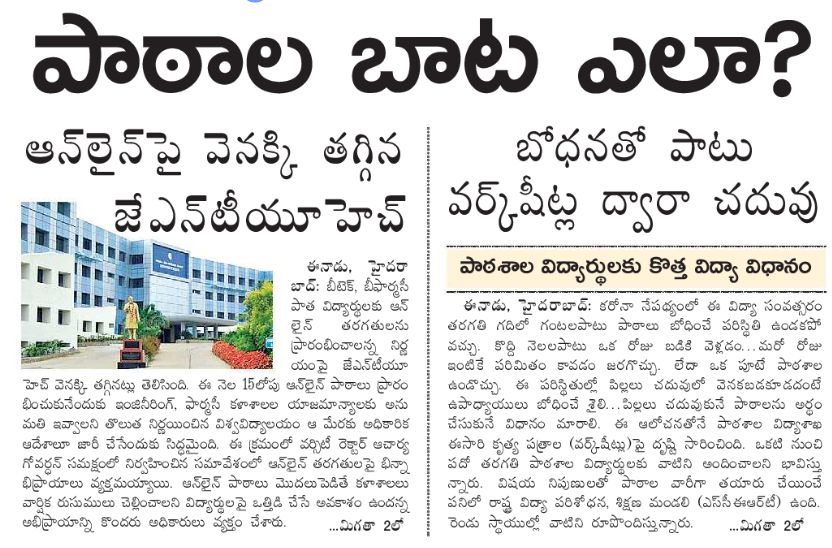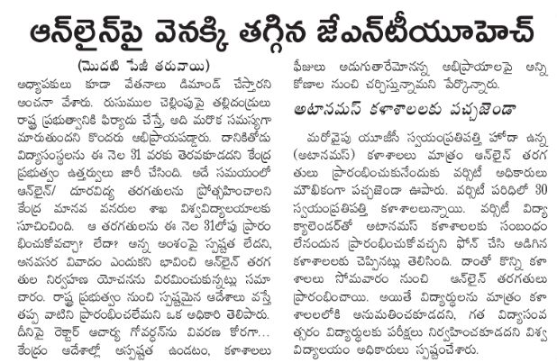 On the other side, UGC has approved permission to autonomous colleges to conduct online classes. 30 autonomous colleges are presently working Under JNTUH. As there is no association with the varsity calendar, the autonomous colleges were given permission to conduct the online classes. The autonomous colleges started online classes from this Monday. While, the JNTUH has strictly mentioned that students will not be permitted to attend the classes in colleges and also not going conduct the examinations.
