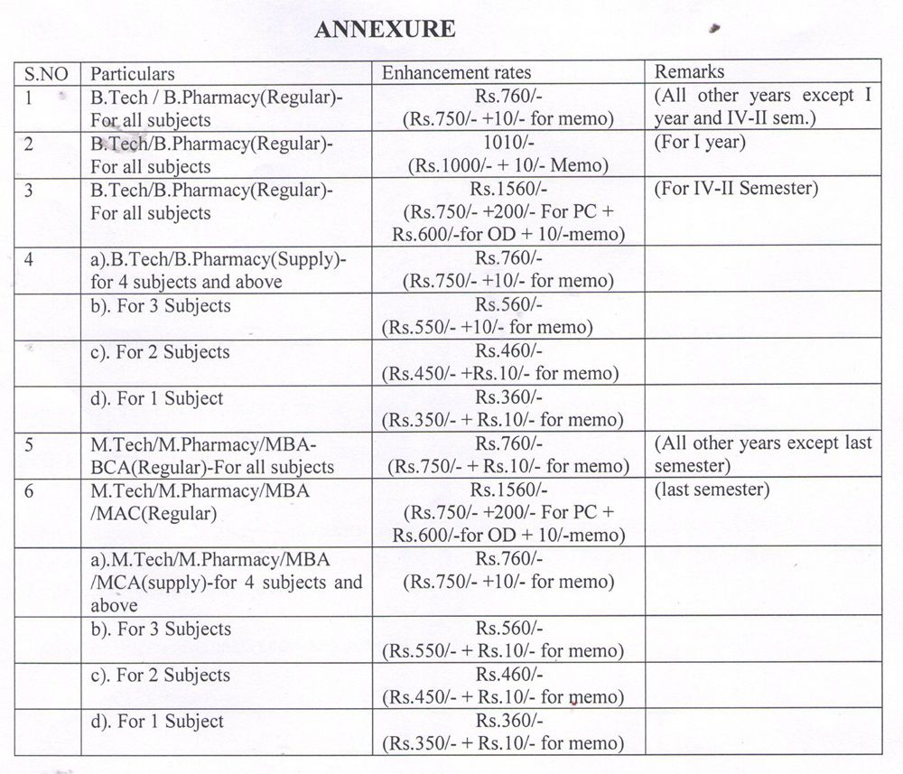 JNTUH Enhancement of Examination Fee for different courses
