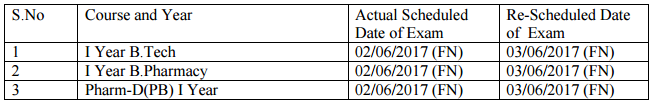 It is here by informed that the B.TECH, B.PHARMACY and Pharm-D(PB) courses Examinations to be held on 02-06-2017 are postponed and rescheduled as mentioned below.
