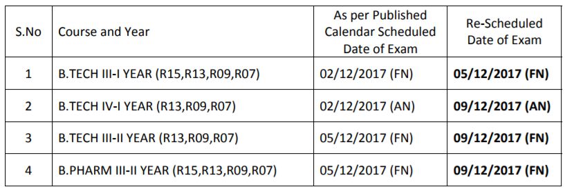 It is here by informed that the B.TECH/B.PHARMACY courses Examinations to be held on 02‐12‐2017(FN & AN) and 05‐12‐2017(FN) are postponed and rescheduled as mentioned below.