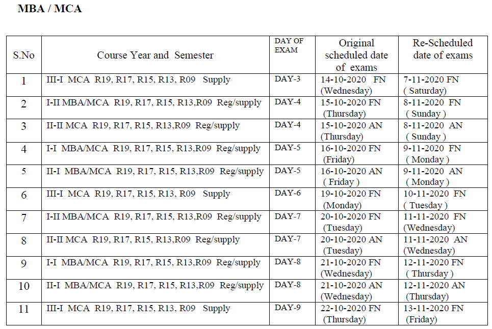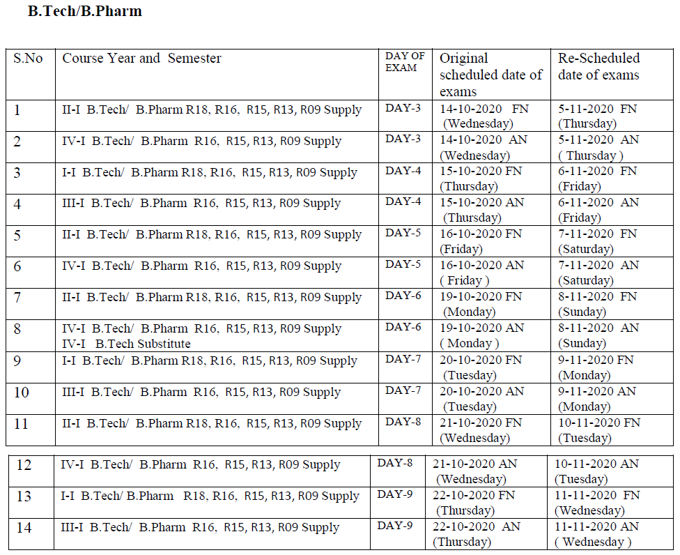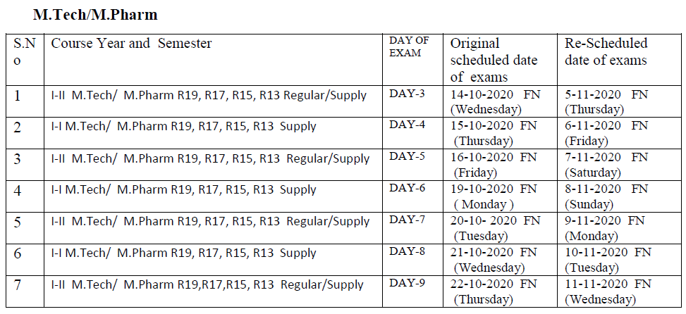 It is here by informed that the B.Tech/ B.Pharm/ M.Tech/ M.Pharm/ Pharm.D Pharm.D(PB) /MBA / MCA Regular and Supplementary University Examinations which were supposed to be held from 14-10-2020 to 22-10-2020 are rescheduled as mentioned below: