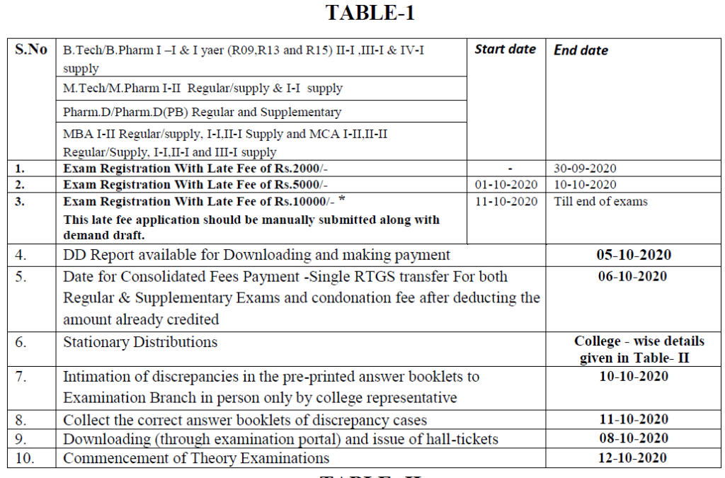 All the Principals are informed to note the revised schedules for various activities of B.Tech I-I (R18, R16), B.Pharm I-I (R17, R16), B.Tech / B.Pharm I year (R09,R13 and R15), B.Tech / B.Pharm II-I, III-I & IV-I supply, M.Tech/M.Pharm I-II Regular/supply & I-I supply and Pharm.D / Pharm.D(PB) Regular and Supplementary and MBA I-II Regular/supply, I-I, II-I Supply, MCA I-II, II-II Regular/Supply, I-I,II-I and III-I supply Examinations as shown in Table-1 hereunder. These examinations (spell-2 examinations) are scheduled to commence from 12-10-2020 (Monday).