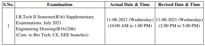 All the Principals of affiliated colleges are hereby informed that the following I B.Tech II Sem Supplementary(R16) Examination already scheduled on 11.08.2021(AM) have been postponed to Afternoon Session on the same day. The students may be informed accordingly.