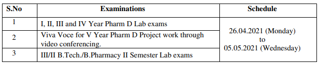 All the Principals of affiliated colleges are hereby informed to conduct Laboratory external examinations, Project work for Pharm D I, II, III, IV, V Year & III/II B.Tech/B.Pharmacy II Semester Supplementary Examinations, April 2021 students as per the following schedule.