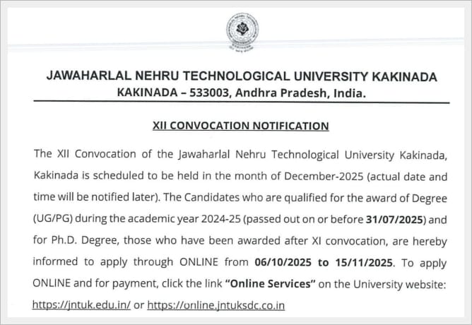 The XII Convocation of the Jawaharlal Nehru Technological University Kakinada, Kakinada is scheduled to be held in the month of December-2025 (actual date and time will be notified later). The Candidates who are qualified for the award of Degree (UG/PG) during the academic year 2024-25 (passed out on or before 31/07/2025) and for Ph.D. Degree, those who have been awarded after XI convocation, are hereby informed to apply through ONLINE from 06/10/2025 to 15/11/2025. To apply ONLINE and for payment, click the link “Online Services” on the University website: https://jntuk.edu.in or https://online.jntuksdc.co.in