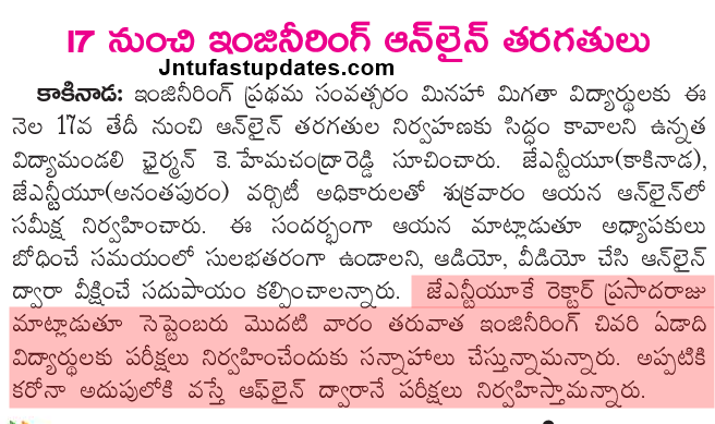 Latest News (08-08-2020): కాకినాడ: ఇంజినీరింగ్ ప్రథమ సంవత్సరం మినహా మిగతా విద్యార్థులకు ఈ నెల 17వ తేదీ నుంచి ఆన్ లైన్ తరగతుల నిర్వహణకు సిద్ధం కావాలని ఉన్నత విద్యామండలి ఛైర్మన్ కె. హేమచంద్రారెడ్డి సూచించారు. జేఎన్టీయూ(కాకినాడ), జేఎన్టీయూ(అనంతపురం) వర్సిటీ అధికారులతో శుక్రవారం ఆయన ఆన్ లైన్ సమీక్ష నిర్వహించారు. ఈ సందర్భంగా ఆయన మాట్లాడుతూ అధ్యాపకులు బోధించే సమయంలో సులభతరంగా ఉండాలని, ఆడియో, వీడియో చేసి ఆన్ లైన్ ద్వారా వీక్షించే సదుపాయం కల్పించాలన్నారు. జేఎన్టీయూకే రెక్టార్ ప్రసాదరాజు మాట్లాడుతూ సెప్టెంబరు మొదటి వారం తరువాత ఇంజినీరింగ్ చివరి ఏడాది విద్యార్థులకు పరీక్షలు నిర్వహించేందుకు సన్నాహాలు చేస్తున్నామన్నారు. అప్పటికి కరోనా అదుపులోకి వస్తే ఆఫ్ లైన్ ద్వారానే పరీక్షలు నిర్వహిస్తామన్నారు. (Final Exams will be held After First week of September 2020).