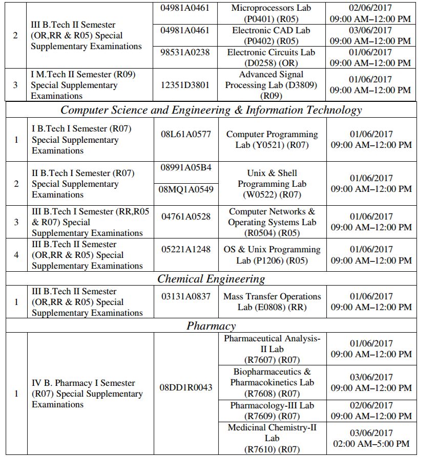The Principals of the affiliated colleges are hereby informed that the following Special Supplementary (UG & PG) Laboratory Examinations – June, 2017 will be conducted at University College 0f Engineering, JNTUK, Kakinada only. The Lab schedule as detailed below.
