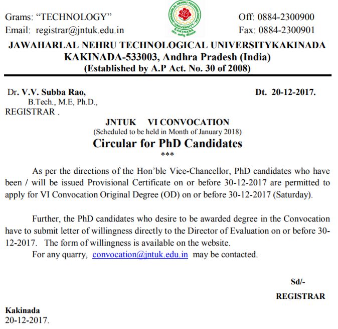 JNTUK Last date to Apply for VI Convocation OD is extended to 30-12-2017 (PhD candidates only)