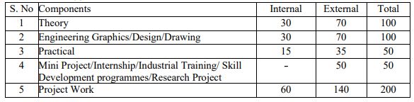 (iv) Distribution and Weightage of marks: The assessment of the student’s performance in each course will be based on Continuous Internal Evaluation (CIE) and Semester-End Examination (SEE). The performance of a student in each semester shall be evaluated subject–wise with a maximum of 100 marks for theory subject and 50 marks for practical subject. For theory subjects the distribution shall be 30 marks for Internal Evaluation and 70 marks for the End Examinations.
