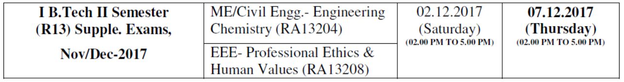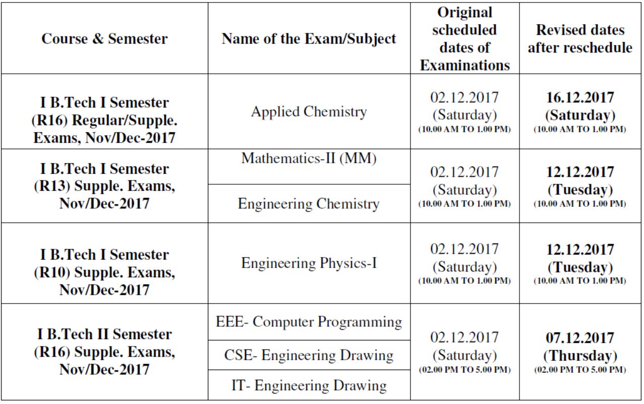 The Principals of all the affiliated colleges are hereby informed that the following I B. Tech I Semester (R16, R13, R10) & I B. Tech II Semester (R16, R13) Regular/Supplementary Examinations, Nov/Dec-2017 have been Rescheduled. The examinations are rescheduled to the following dates as given below.
