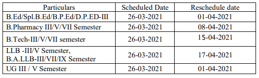 Having considered the subject and reference above, the Vice –Chancellor has ordered the B.Ed/ Spl.B.Ed/ B.P.Ed/ D.P.ED-III, LLB- III/V Semester, B.A.LLB-III/ VII /IX Semester, B.Pharmacy III / V/ VII Semester, B.Tech-III /V /VII semester and UG III/V semester theory examinations which are scheduled on 26-03-2021 are postponed, due to BHARAT BANDH. The rescheduled dates of examinations are given below.