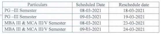 Having considered the subject and reference above, the Vice —Chancellor has ordered the PG III Semester, MBA III Semester and MCA III/V semester examinations which are scheduled on 08-03-2021 and 09-03-2021 are postponed, due to Municipal and MLC Elections. The rescheduled dates of examinations are given below.