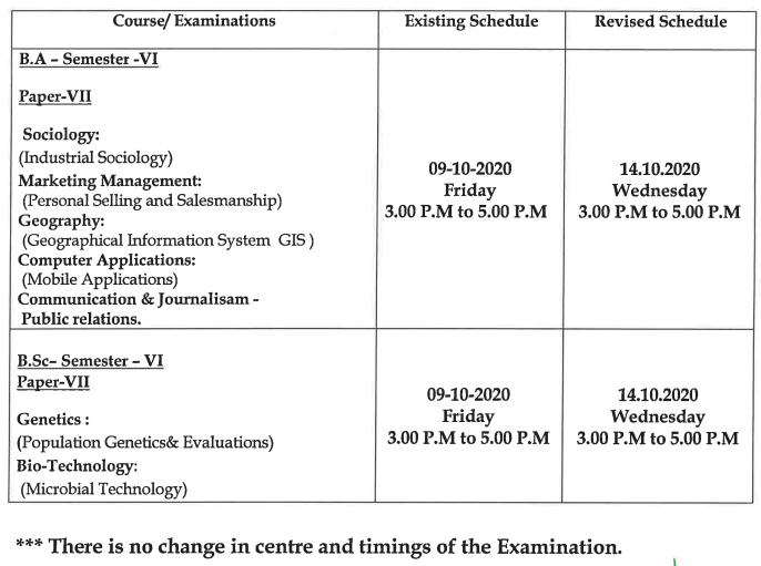 In view of the LAWCET Entrance, the Examinations of UG(CBC) SEMESTER — VI (Regular & Backlog) B.A/B.Sc Sept/Oct-2020, which is scheduled on 9th October 2020 is only postpone$ and rescheduled with following details. The remaining examinations will be held as per the schedule.