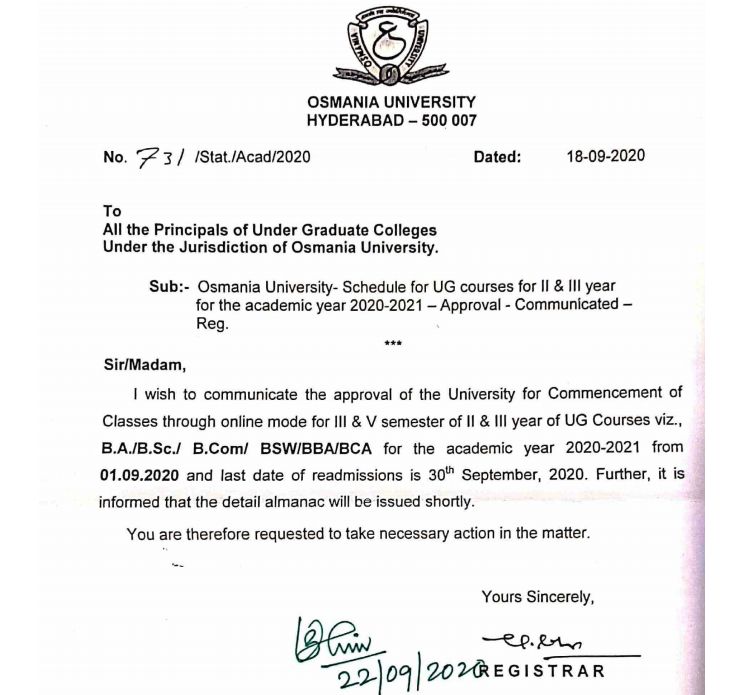 I wish to communicate the approval of the University for Commencement of Classes through online mode for III & V semester of II & III year of UG Courses viz., B.A. / B.Sc. / B.Com/ BSW / BBA / BCA for the academic year 2020-2021 from 01.09.2020 and last date of readmissions is 30th September, 2020. Further, it is informed that the detail almanac will be issued shortly. You are therefore requested to take necessary action in the matter.