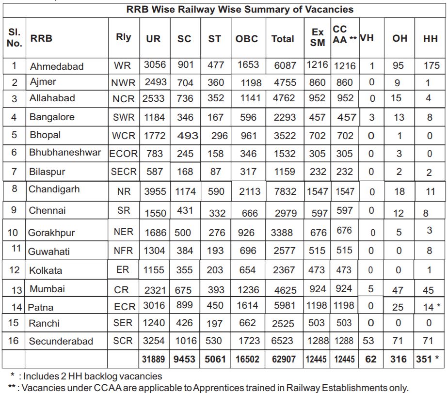 Vacancies indicated in the CEN are provisional and may increase or decrease in total or in specific Units/communities/posts at a later stage depending upon the actual needs of the Railway Administrations. The Vacancy Table indicating the actual needs of the Railway Administrations. The Vacancy Table indicating the vacancies for UR/SC/ ST/OBC/ExSM and PWD for various posts in various Railways is available in the detailed CEN published on the websites of RRBs.