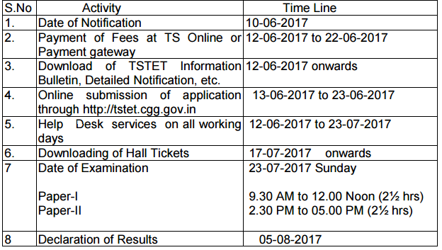 Detailed procedure for applying ONLINE is given in the Information Bulletin. Candidates can download the ‘Information Bulletin’ free of cost from the TS-TET website: http://tstet.cgg.gov.in from 12.06.2017 onwards. Candidates submit their applications online from 13.06.2017 to 23.06.2017.