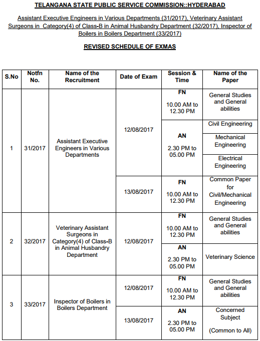 TSPSC AEE, VAS, Inspector of Boilers Revised Exam Schedule: Assistant Executive Engineers in Various Departments (31/2017), Veterinary Assistant Surgeons in Category(4) of Class-B in Animal Husbandry Department (32/2017), Inspector of Boilers in Boilers Department (33/2017)