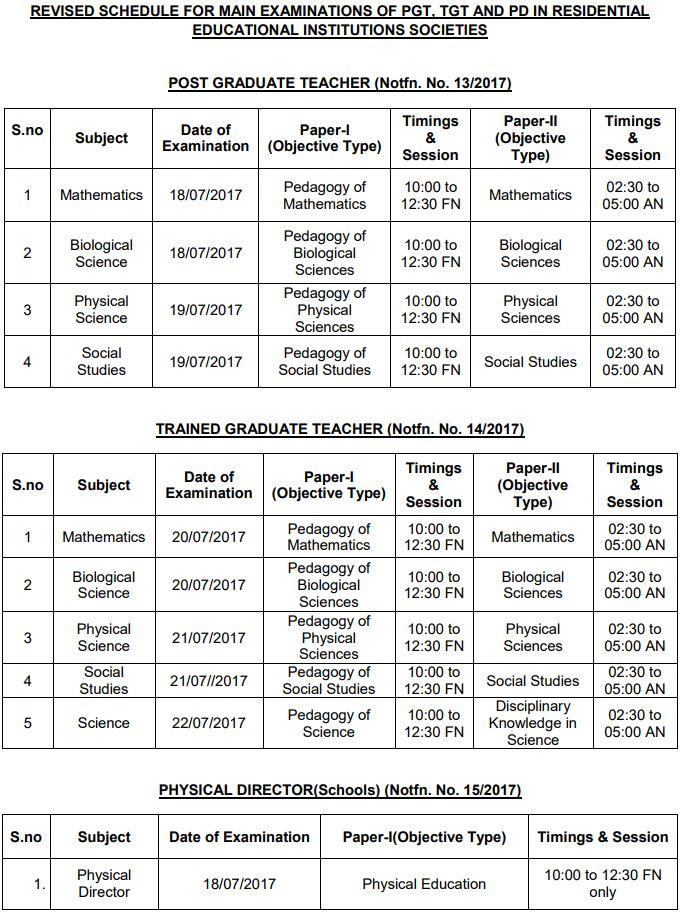 REVISED SCHEDULE FOR MAIN EXAMINATIONS OF PGT, TGT AND PD IN RESIDENTIAL EDUCATIONAL INSTITUTIONS SOCIETIES