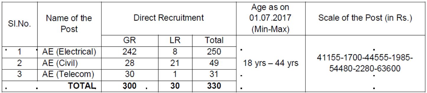 No. of vacancies to be filled up by Direct Recruitment / General Recruitment: 330 (250 Electrical, 49 Civil, 31 Telicom)