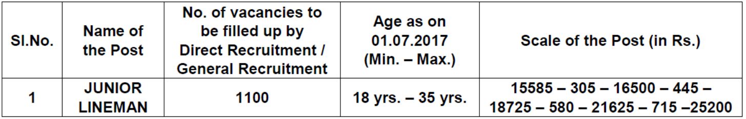 Must possess SSLC/SSC/10th Class with I.T.I. qualification in Electrical Trade/ Wireman or 2 years Intermediate Vocational course in Electrical Trade only from a recognized Institution/Board or Institutions registered during combined A.P. / Telangana State Education Department as on the date of notification