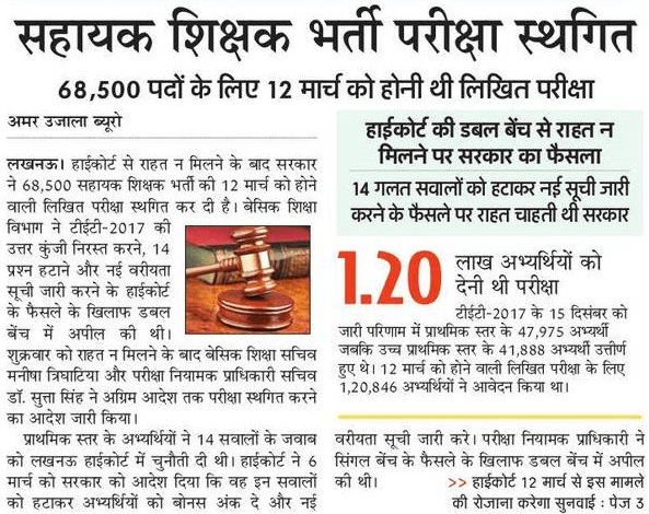 Latest Update on March 12th : This is the latest Newspaper clipping taken from Amar Ujala Newspaper. There is no mention regarding this change in UP Assistant Teacher Exam Dates on the Official Website. Exam is Postponed and New Dates will Announce soon.